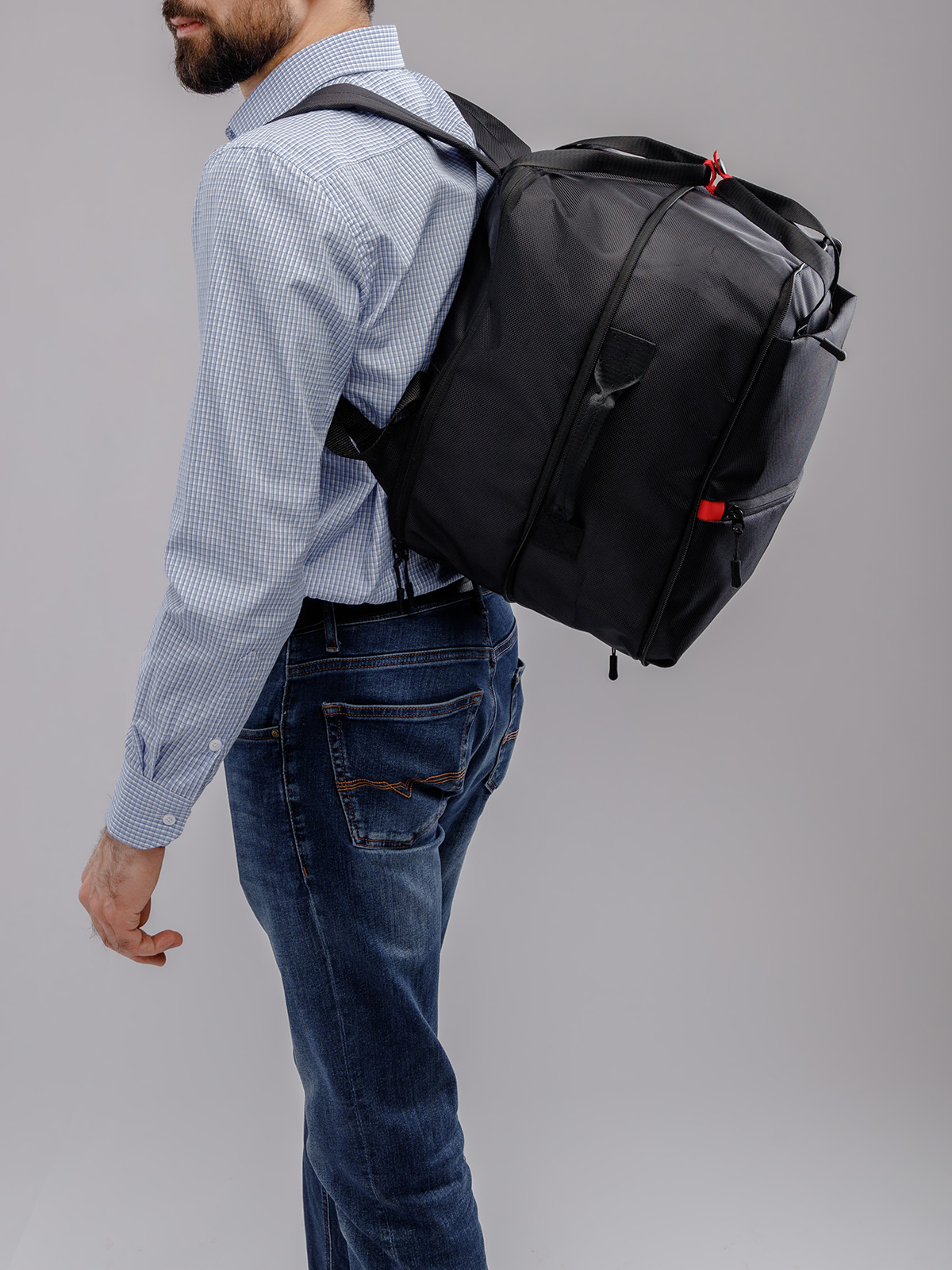 Рюкзак-трансформер увеличивается в ширину на 12 см и превращается в дорожный саквояж, который по габаритам является ручной кладью для стандартов авиакомпании "Победа". Имеет крепление на ручку чемодана.